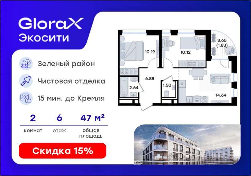 Продается 2-комн. квартира на 6-м этаже в строящемся проекте GloraX Экосити. Общая площадь лота составляет 47,80 кв. м, из которых 20,31 кв. м отведено под жилую и 14,64 кв. м под кухонную зону. Номер квартиры - 29