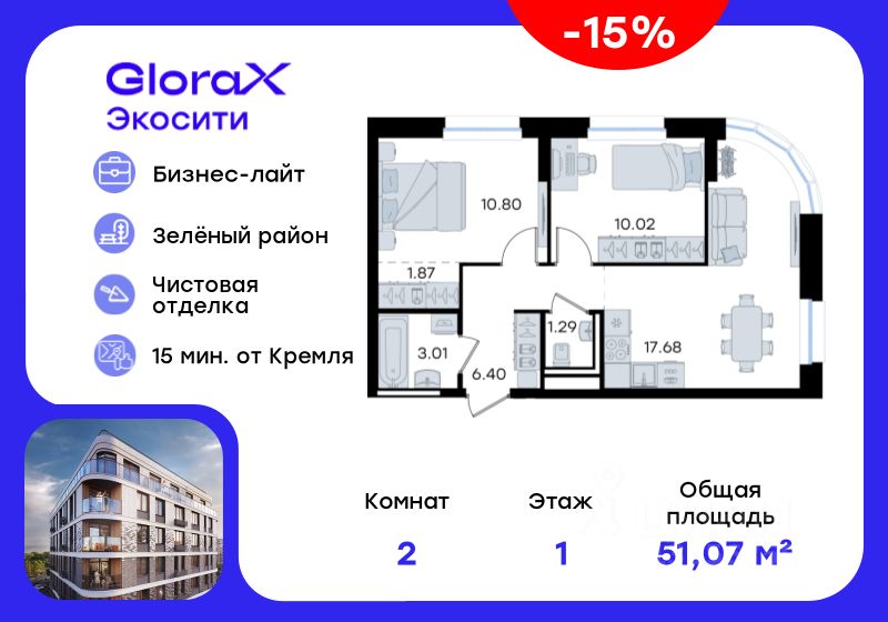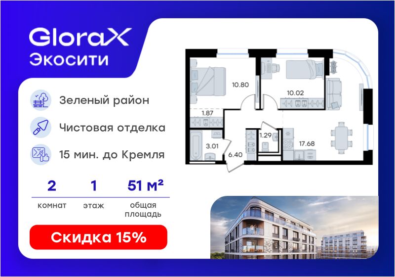 Продается 2-комн. квартира на 1-м этаже в строящемся проекте GloraX Экосити. Общая площадь лота составляет 51,07 кв. м, из которых 20,82 кв. м отведено под жилую и 17,68 кв. м под кухонную зону. Номер квартиры - 61