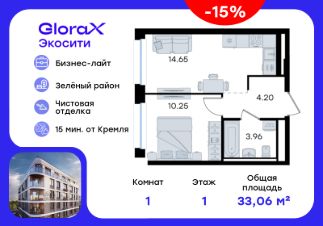 Продается 1-комн. квартира на 1-м этаже в строящемся проекте GloraX Экосити. Общая площадь лота составляет 33,06 кв. м, из которых 10,25 кв. м отведено под жилую и 14,65 кв. м под кухонную зону. Номер квартиры - 62