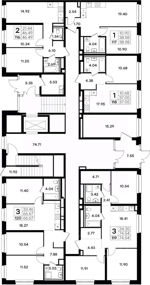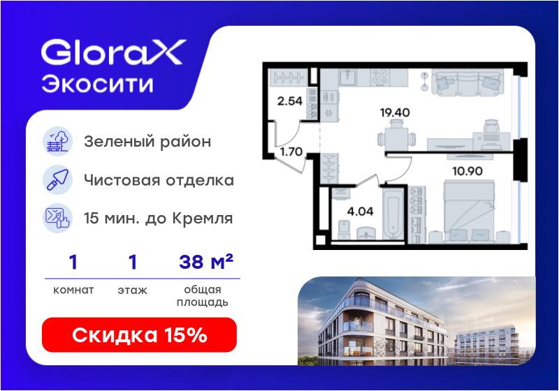 Продается 1-комн. квартира на 1-м этаже в строящемся проекте GloraX Экосити. Общая площадь лота составляет 38,58 кв. м, из которых 10,90 кв. м отведено под жилую и 19,40 кв. м под кухонную зону. Номер квартиры - 117