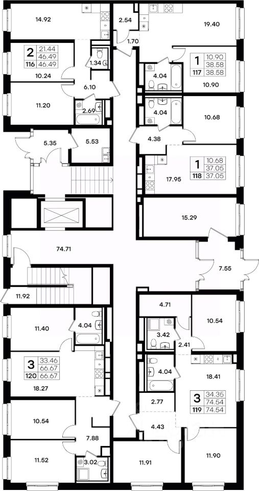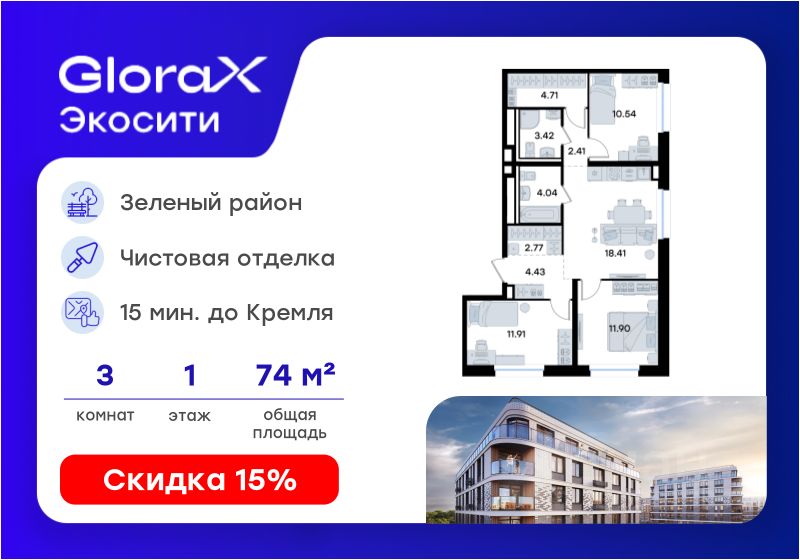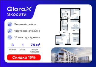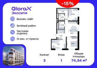 Продается 3-комн. квартира на 1-м этаже в строящемся проекте GloraX Экосити. Общая площадь лота составляет 74,54 кв. м, из которых 34,35 кв. м отведено под жилую и 18,41 кв. м под кухонную зону. Номер квартиры - 119