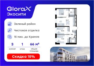 Продается 3-комн. квартира на 1-м этаже в строящемся проекте GloraX Экосити. Общая площадь лота составляет 66,67 кв. м, из которых 33,46 кв. м отведено под жилую и 18,27 кв. м под кухонную зону. Номер квартиры - 120