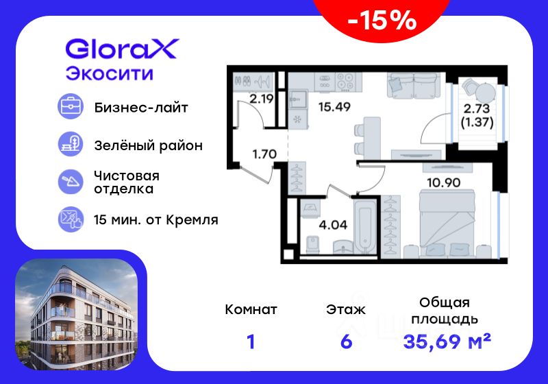 Продается 1-комн. квартира на 6-м этаже в строящемся проекте GloraX Экосити. Общая площадь лота составляет 35,69 кв. м, из которых 10,90 кв. м отведено под жилую и 15,49 кв. м под кухонную зону. Номер квартиры - 155