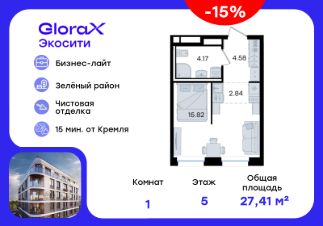 Продается квартира-студия на 5-м этаже в строящемся проекте GloraX Экосити. Общая площадь лота составляет 27,41 кв. м, из которых 15,82 кв. м отведено под жилую и 2,84 кв. м под кухонную зону. Номер квартиры - 209