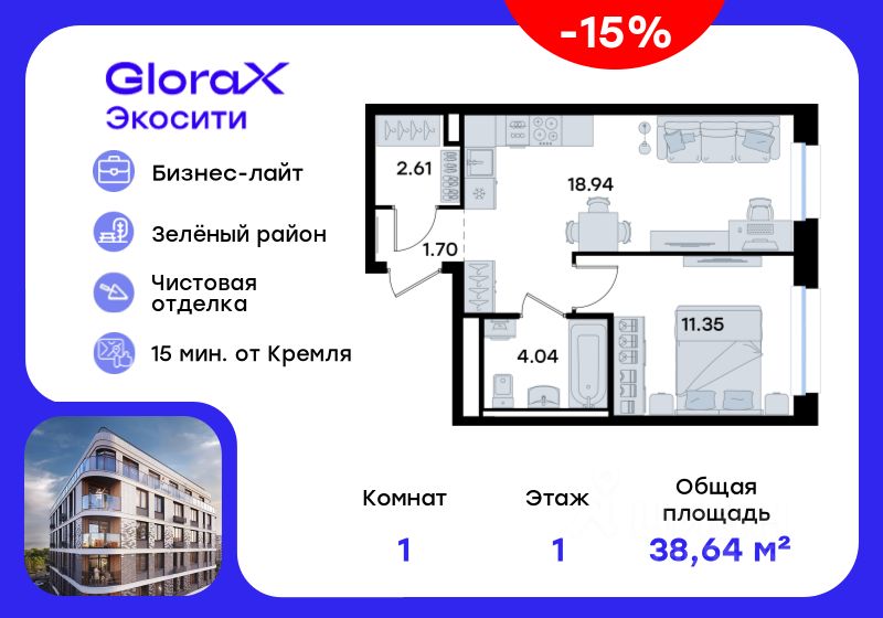 Продается 1-комн. квартира на 1-м этаже в строящемся проекте GloraX Экосити. Общая площадь лота составляет 38,64 кв. м, из которых 11,35 кв. м отведено под жилую и 18,94 кв. м под кухонную зону. Номер квартиры - 316