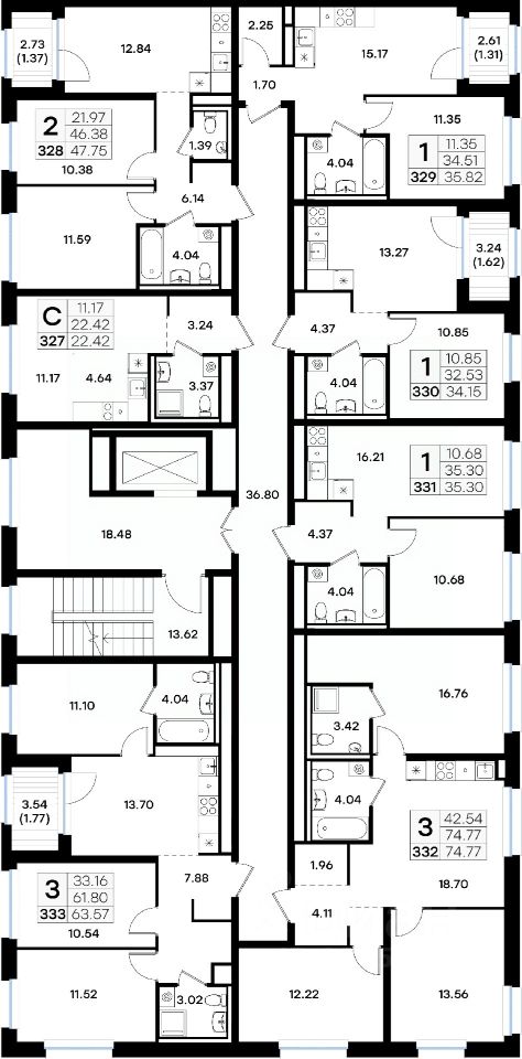 Продается 1-комн. квартира на 3-м этаже в строящемся проекте GloraX Экосити. Общая площадь лота составляет 34,15 кв. м, из которых 10,85 кв. м отведено под жилую и 13,27 кв. м под кухонную зону. Номер квартиры - 330