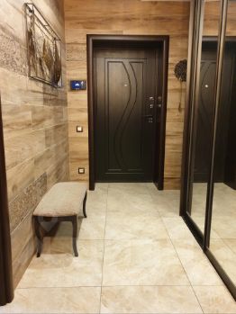 В прихожей вас встретят также тепло и уют. Стены, облицованные керамогранитом с текстурой дерева, очень приятные на ощупь и практичные в использовании. Вместительные шкафы-купе с зеркальными фасадами, расположенные в прихожей и комнатах, визуально расширяют пространство.