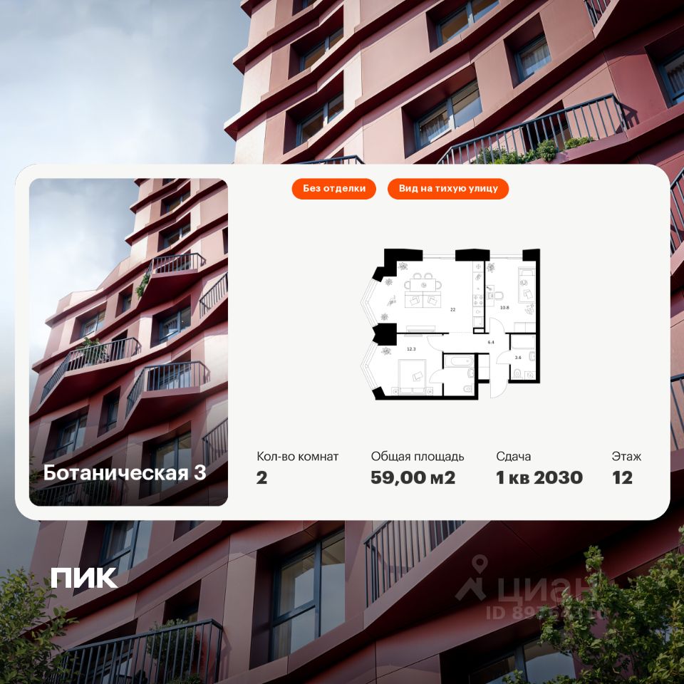 Продаётся 2-комн. квартира площадью 59 кв.м на 12 этаже 15 этажного дома (Корпус 2, Секция 9) проекта ПИК Ботаническая 3. Светлый просторный подъезд на уровне земли, функциональная планировка, большие окна, без отделки.