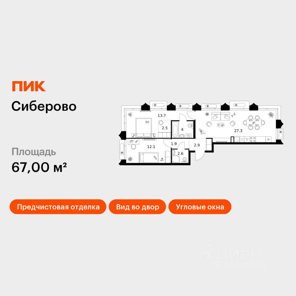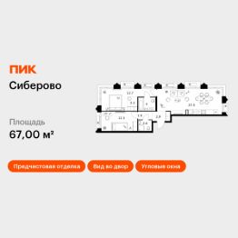 Продаётся 2-комн. квартира площадью 67 кв.м на 24 этаже 26 этажного дома (Корпус 3, Секция 3) проекта ПИК Сиберово. Светлый просторный подъезд на уровне земли, функциональная планировка, большие окна, предчистовая отделка.