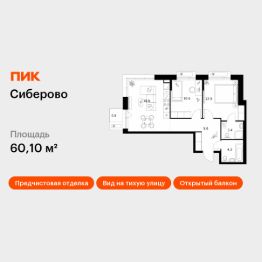 Продаётся 2-комн. квартира площадью 60,1 кв.м на 4 этаже 16 этажного дома (Корпус 3, Секция 6) проекта ПИК Сиберово. Светлый просторный подъезд на уровне земли, функциональная планировка, большие окна, предчистовая отделка.