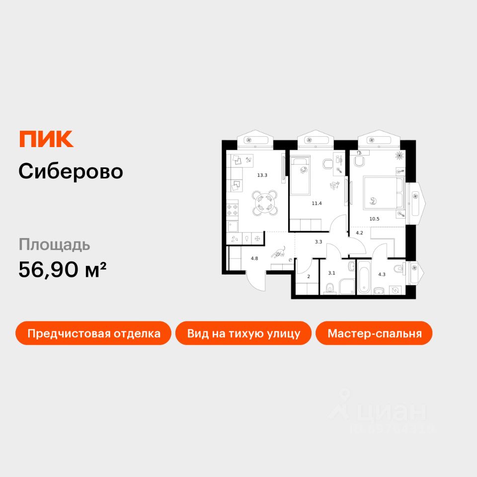Продаётся 2-комн. квартира площадью 56,9 кв.м на 15 этаже 26 этажного дома (Корпус 3, Секция 3) проекта ПИК Сиберово. Светлый просторный подъезд на уровне земли, функциональная планировка, большие окна, предчистовая отделка.