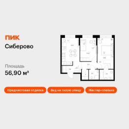 Продаётся 2-комн. квартира площадью 56,9 кв.м на 7 этаже 26 этажного дома (Корпус 3, Секция 3) проекта ПИК Сиберово. Светлый просторный подъезд на уровне земли, функциональная планировка, большие окна, предчистовая отделка.