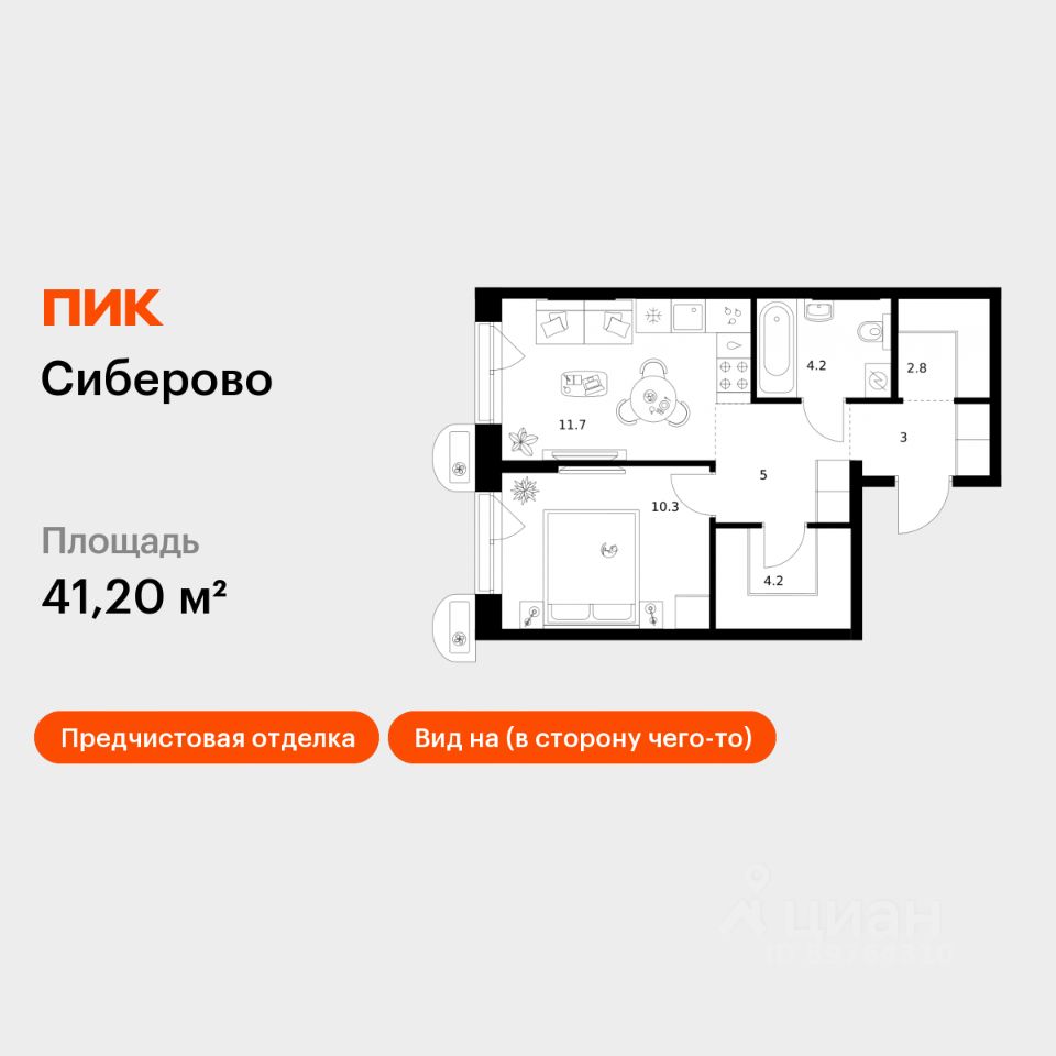 Продаётся 1-комн. квартира площадью 41,2 кв.м на 1 этаже 26 этажного дома (Корпус 3, Секция 4) проекта ПИК Сиберово. Светлый просторный подъезд на уровне земли, функциональная планировка, большие окна, предчистовая отделка.