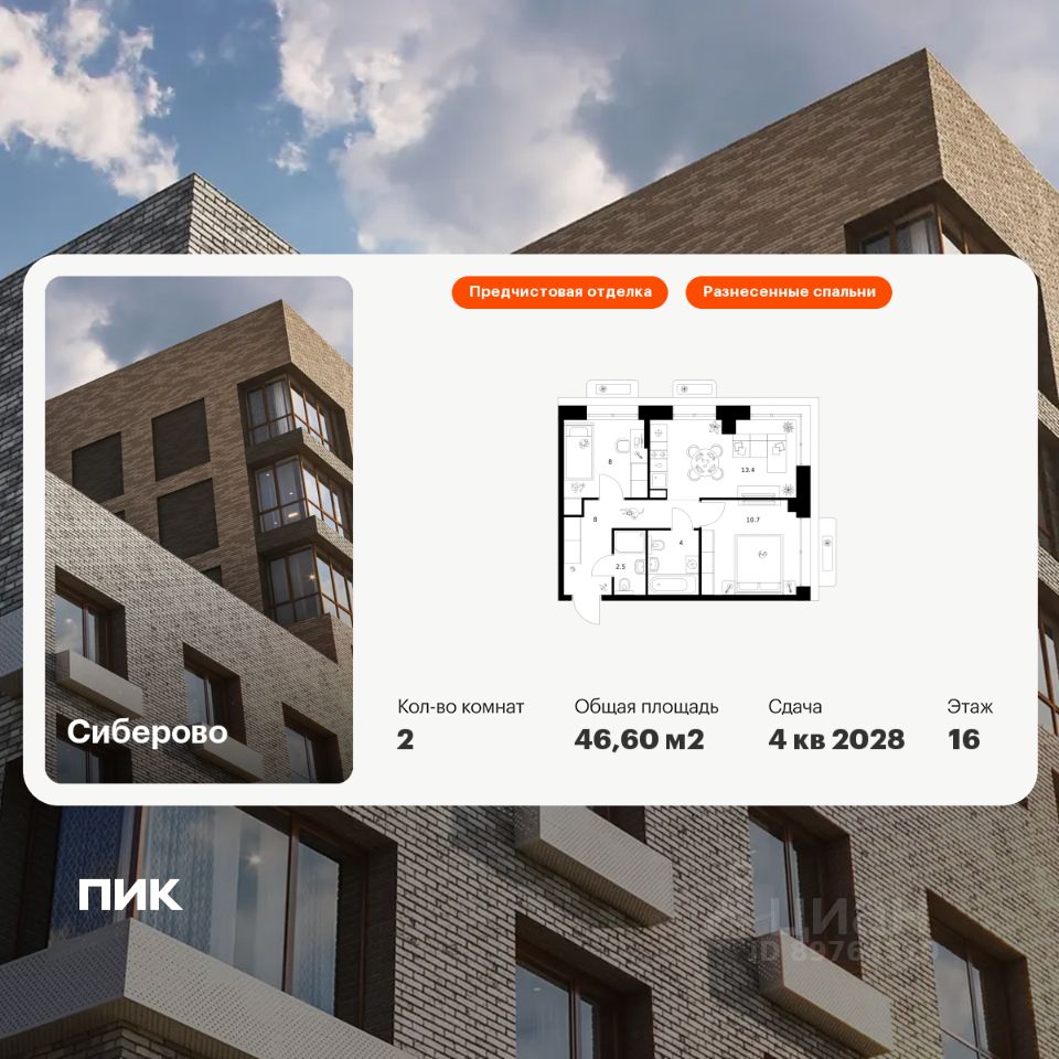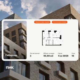 Продаётся 2-комн. квартира площадью 46,6 кв.м на 16 этаже 16 этажного дома (Корпус 3, Секция 1) проекта ПИК Сиберово. Светлый просторный подъезд на уровне земли, функциональная планировка, большие окна, предчистовая отделка.