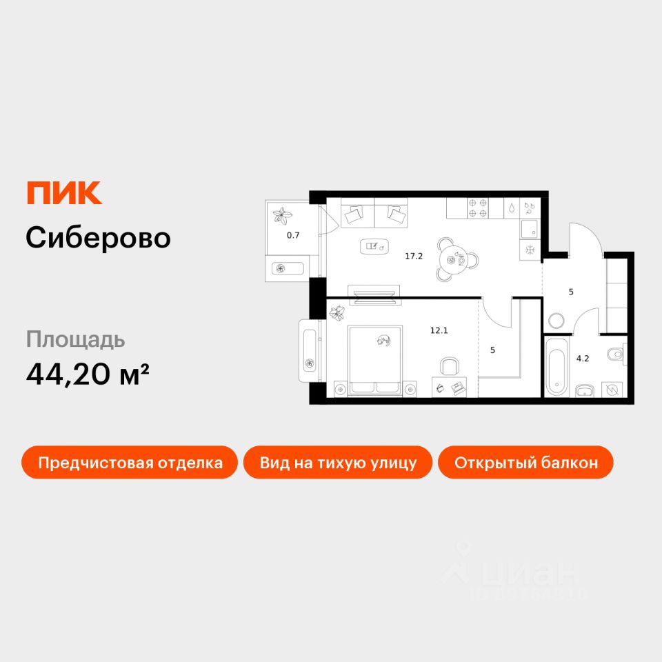 Продаётся 1-комн. квартира площадью 44,2 кв.м на 4 этаже 26 этажного дома (Корпус 3, Секция 5) проекта ПИК Сиберово. Светлый просторный подъезд на уровне земли, функциональная планировка, большие окна, предчистовая отделка.