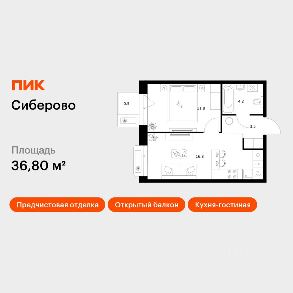Продаётся 1-комн. квартира площадью 36,8 кв.м на 2 этаже 26 этажного дома (Корпус 3, Секция 7) проекта ПИК Сиберово. Светлый просторный подъезд на уровне земли, функциональная планировка, большие окна, предчистовая отделка.