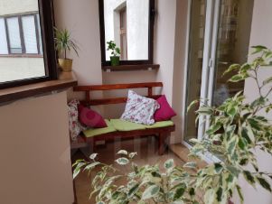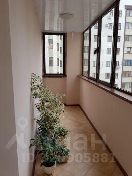 Большая светлая лоджия 7 кв.м. с выходом из кухни, застекленная алюминиевыми рамами.