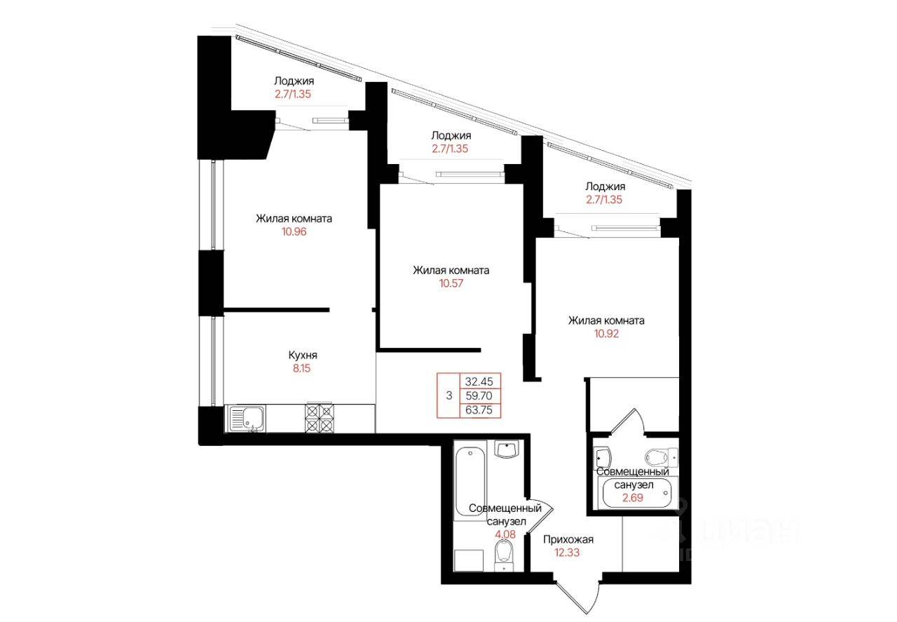 Общая площадь63,75 м²