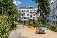 Двор чистый, ухоженный, есть детская площадка и куча парковочных мест во дворе.