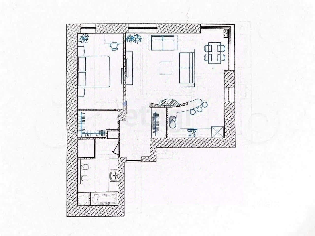 Перепланировка согласована и выполнена с учетом эргономики: кухня-гостиная увеличена за счет части коридора, что создает ощущение простора.