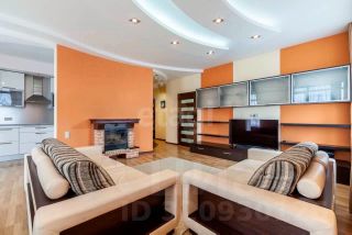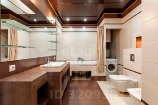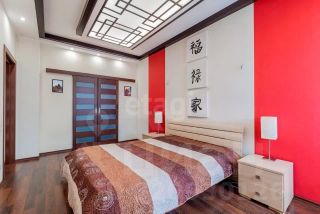 Ремонт выполнен с использованием долговечных материалов — керамогранита в зоне прихожей, паркетной доски в жилых помещениях, натяжных потолков с точечным освещением. В зоне общего пользования применен натуральный мрамор.