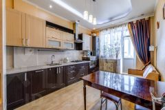 Большой плюс — это просторная кухня в 14,6 кв.м. с посудомоечной машиной и электрическим духовым шкафом, вытяжкой.