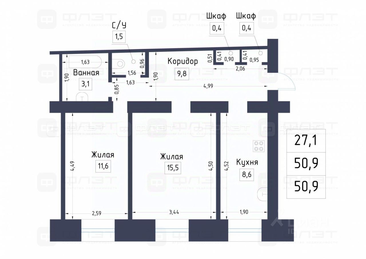 Объект 105639 Квартира в центре города. Без обремененийВахитовский район. Ул. Право-Булачная д.37. Продается уникальная 2-х комнатная сталинка 51/27.1/8.6 кв.м на 5/6 этажного кирпичного дома в самом центре города.