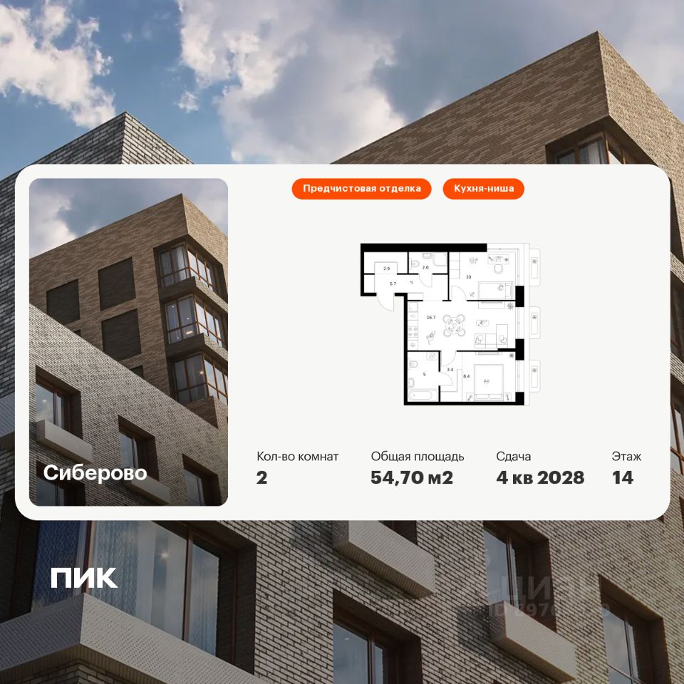 Продаётся 2-комн. квартира площадью 54,7 кв.м на 14 этаже 16 этажного дома (Корпус 3, Секция 1) проекта ПИК Сиберово. Светлый просторный подъезд на уровне земли, функциональная планировка, большие окна, предчистовая отделка.