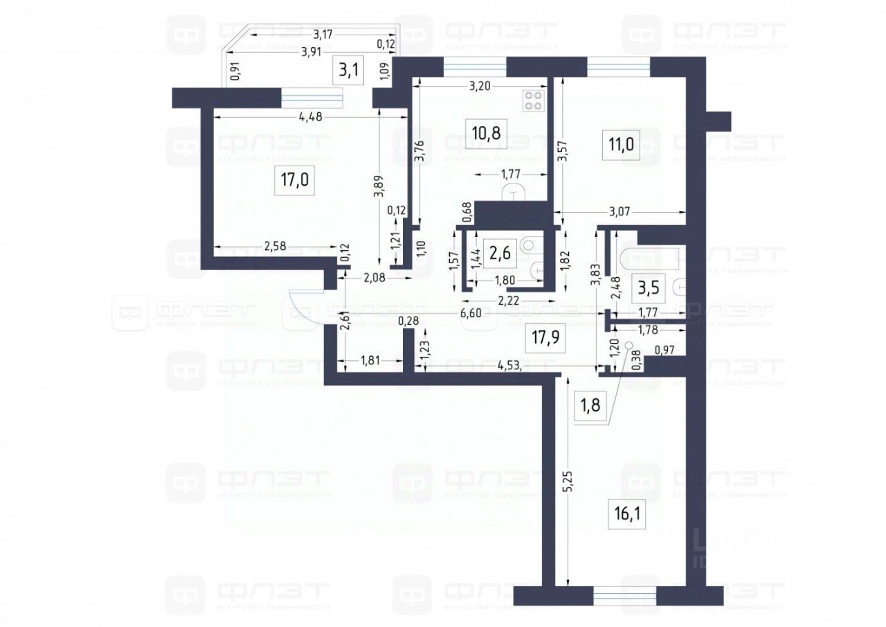 Зал 17.7 кв.м с выходом на лоджию, две спальные комнаты 15.6 и 9.9 кв.м.