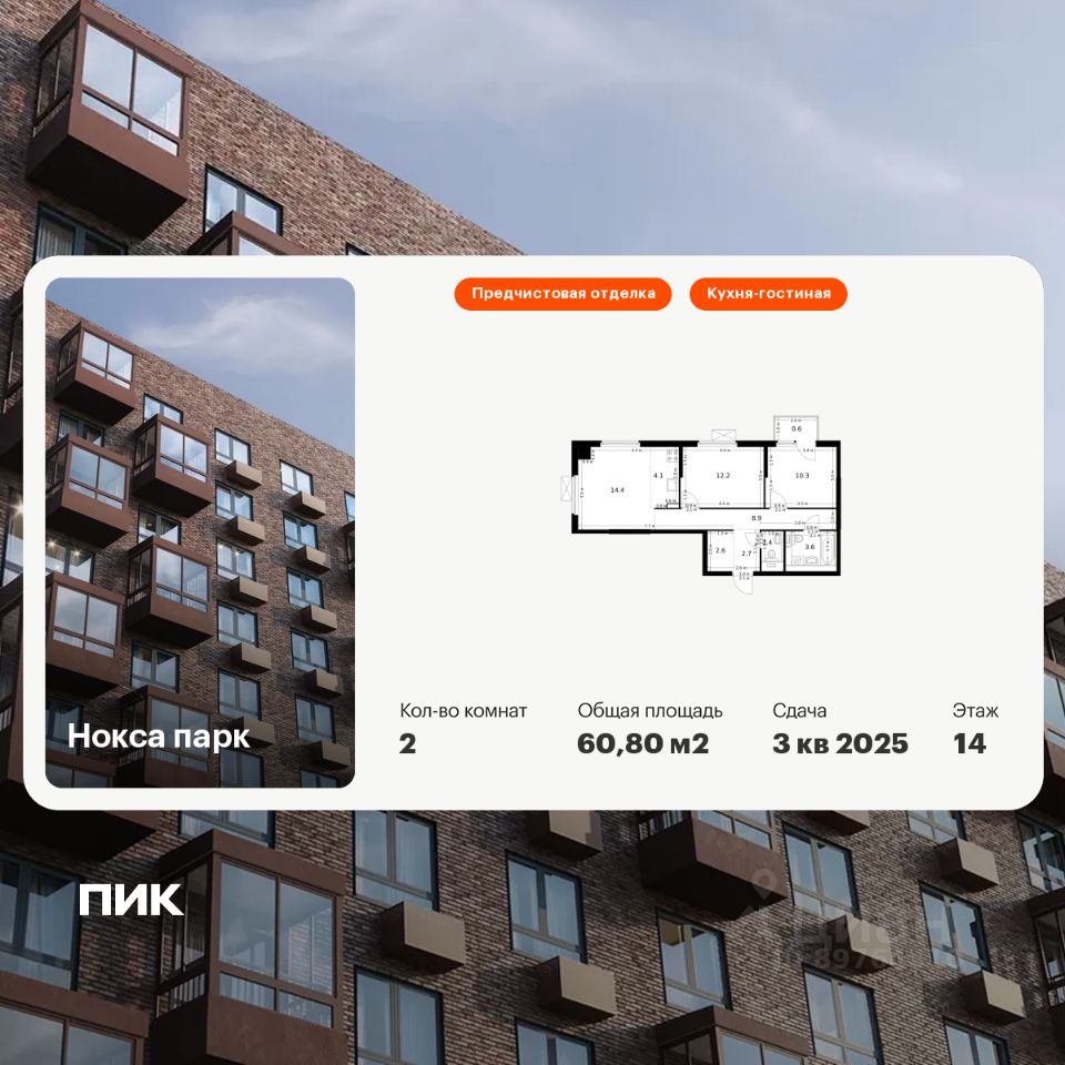 Продаётся 2-комн. квартира площадью 62,7 кв.м на 14 этаже 17 этажного дома (Корпус 4, Секция 1) проекта ПИК Нокса парк. Светлый просторный подъезд на уровне земли, функциональная планировка, большие окна, предчистовая отделка.
