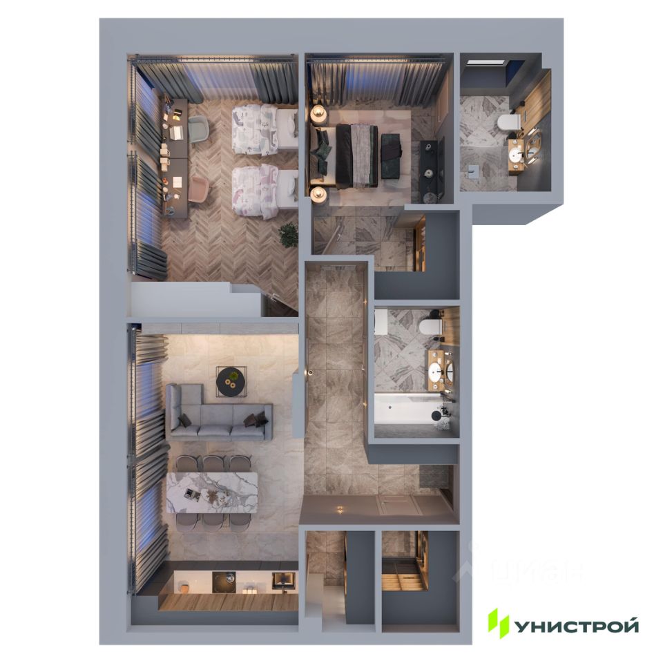 В доме представлен широкий выбор планировок: квартиры с просторными террасами, пентхаусы, мастер-спальнями с личными ванными и гардеробными, угловыми окнами и продуманной геометрией света. Также в проекте — форматы 3-, 4- и 5-комнатных квартир.