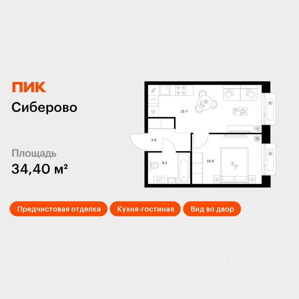 Продаётся 1-комн. квартира площадью 34,4 кв.м на 11 этаже 16 этажного дома (Корпус 3, Секция 1) проекта ПИК Сиберово. Светлый просторный подъезд на уровне земли, функциональная планировка, большие окна, предчистовая отделка.