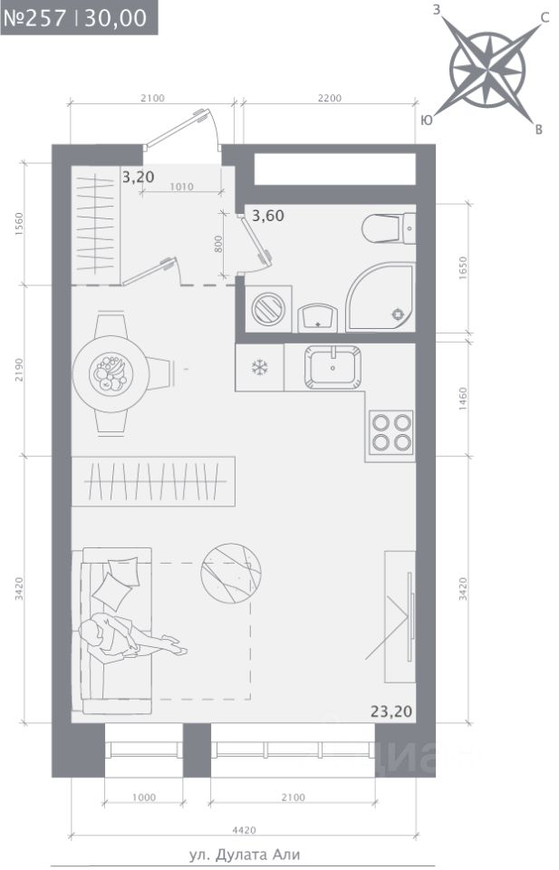 Продаётся студия в строящемся доме (1712), срок сдачи: IV-кв. 2027, общей площадью 30 кв.м., на 8 этаже.