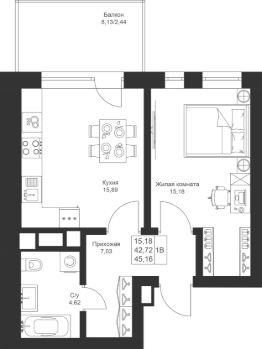 Продается 1-комнатная квартира 79 площадью 45,16 кв.м на 2 этаже в строящемся доме проекта "Новый свет" компании "Ак Барс Дом".