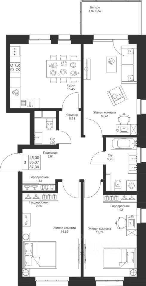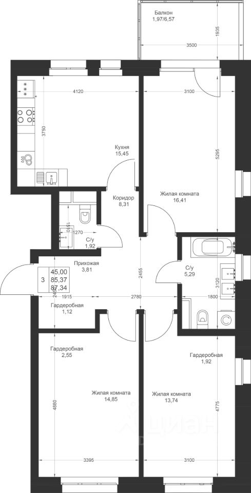 Комфортная 3-комнатная квартира с отдельной кухней и двумя санузлами. В квартире есть просторный балкон, где вы сможете организовать уютное место для отдыха.