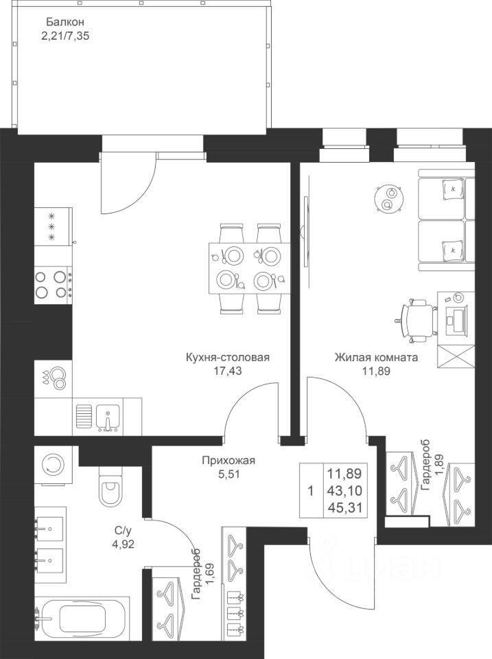 Продается 1-комнатная квартира 112 площадью 45,31 кв.м на 3 этаже в строящемся доме проекта "Новый свет" компании "Ак Барс Дом".