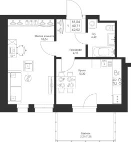 Продается 1-комнатная квартира 116 площадью 42,92 кв.м на 4 этаже в строящемся доме проекта "Новый свет" компании "Ак Барс Дом".
