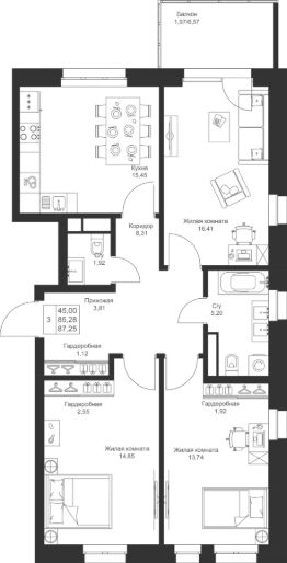 Продается 3-комнатная квартира 119 площадью 87,25 кв.м на 4 этаже в строящемся доме проекта "Новый свет" компании "Ак Барс Дом".