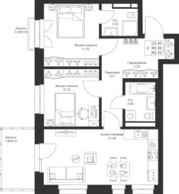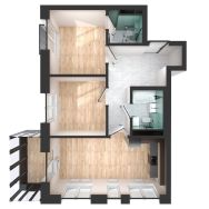 Уютная 2-комнатная квартира с кухней-гостиной и отдельной спальней. На балконе можно обустроить дополнительное место для отдыха или работы. Продуманное зонирование: кухонная зона находится в нише, чтобы скрыть рабочие процессы.