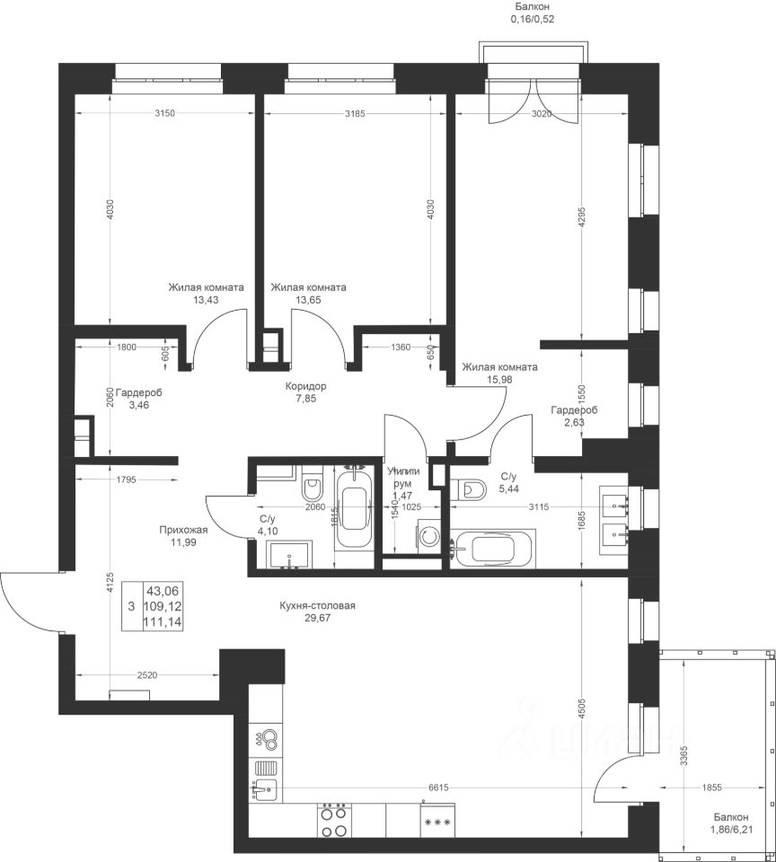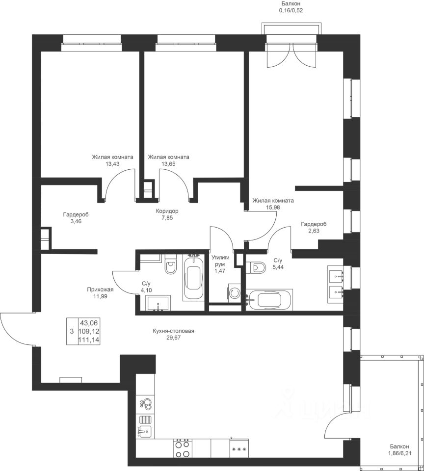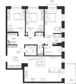 Продается 3 Евро-комнатная квартира 164 площадью 111,14 кв.м на 2 этаже в строящемся доме проекта "Новый свет" компании "Ак Барс Дом".