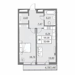 Возможно увеличение площади квартиры до 93,39 м2 за счет объединения со смежной студией.