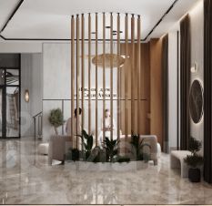 Красивое дизайнерское лобби в природных оттенках встречает жителей дома зоной отдыха. Также на первом этаже предусмотрены колясочная, велопарковка, пункт охраны.