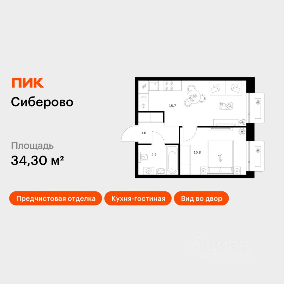Продаётся 1-комн. квартира площадью 34,3 кв.м на 9 этаже 16 этажного дома (Корпус 3, Секция 1) проекта ПИК Сиберово. Светлый просторный подъезд на уровне земли, функциональная планировка, большие окна, предчистовая отделка.