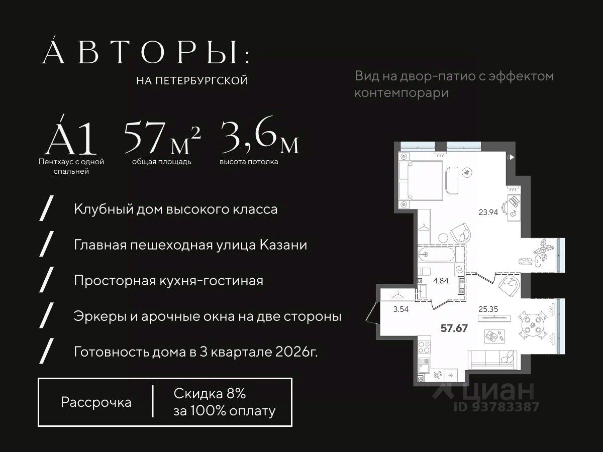 Продается односпальный пентхаус 16 в клубном доме "Авторы на Петербургской" на главной пешеходной улице Казани. Квартира на 3 этаже площадью 57,67 м², высотой потолков до 3,6 м. Квартира сдается в свободной планировке, предоставляя полную свободу для ваших предпочтений в дизайне и возможность подстроить пространство под ваши жизненные ценности.