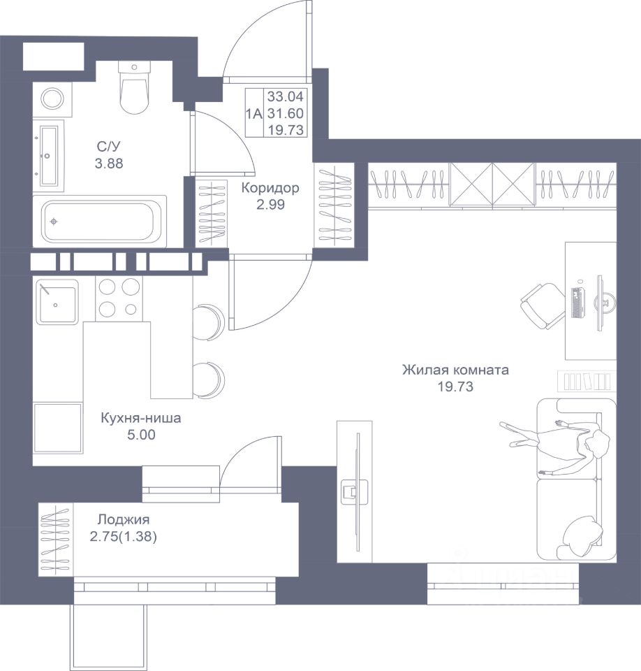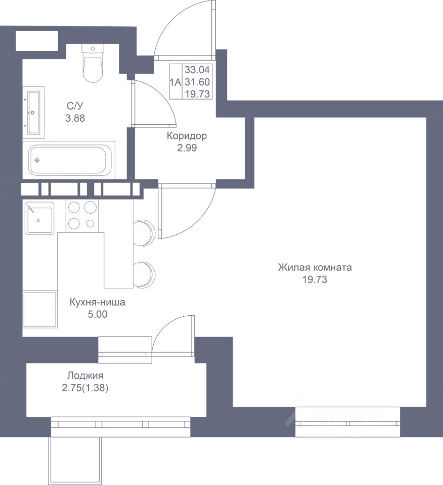 Просторная квартира - студия с гостиной в 19,73 кв.м. Отдельная кухня, из которой открывается выход на лоджию увеличенного размера. Высокие потолки 2,7 м, правильная геометрия комнат для удобной меблировки. В прихожей достаточно места для создания вместительной гардеробной.