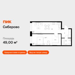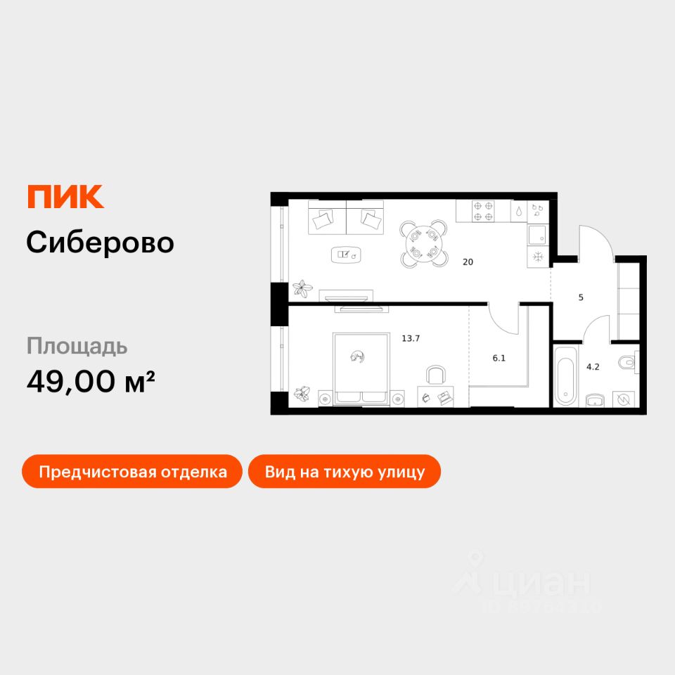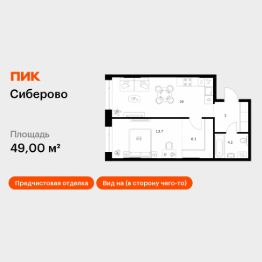 Продаётся 1-комн. квартира площадью 49 кв.м на 1 этаже 26 этажного дома (Корпус 3, Секция 5) проекта ПИК Сиберово. Светлый просторный подъезд на уровне земли, функциональная планировка, большие окна, предчистовая отделка.