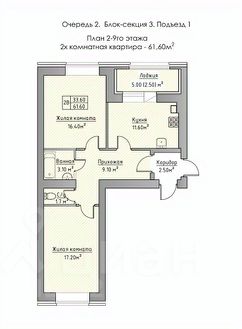 ***Квартира-РАСПАШОНКА, площадью 61,6 кв.м, 2-й этаж, 1 подъезд, НЕ УГЛОВАЯ, в предчистовой отделке: