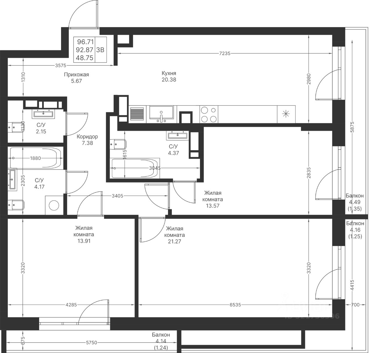 Продается 3-комнатная квартира 485 площадью 96,71 кв.м на 10 этаже в строящемся доме проекта "Мой Ритм" компании "Ак Барс Дом".