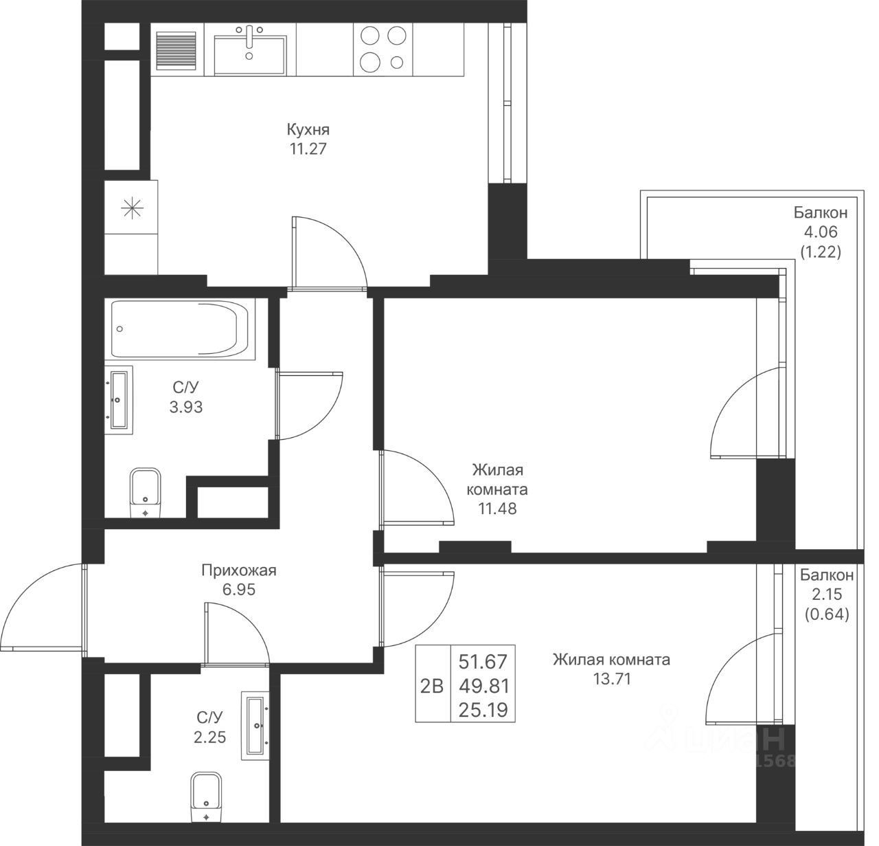 Продается 2-комнатная квартира 336 площадью 51,67 кв.м на 15 этаже в строящемся доме проекта "Мой Ритм" компании "Ак Барс Дом".