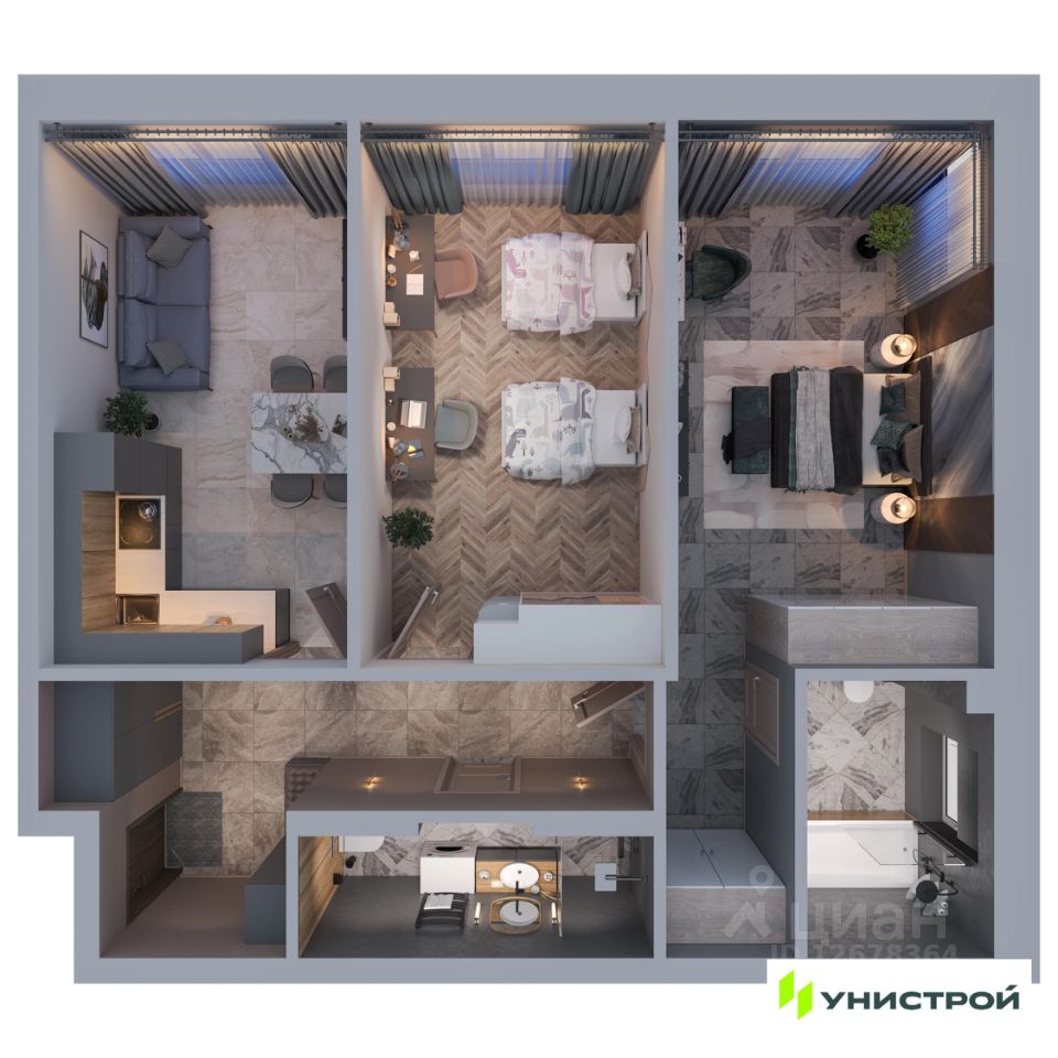 В доме представлен широкий выбор планировок: квартиры с просторными террасами, пентхаусы, мастер-спальнями с личными ванными и гардеробными, угловыми окнами и продуманной геометрией света. Также в проекте — форматы 3-, 4- и 5-комнатных квартир.